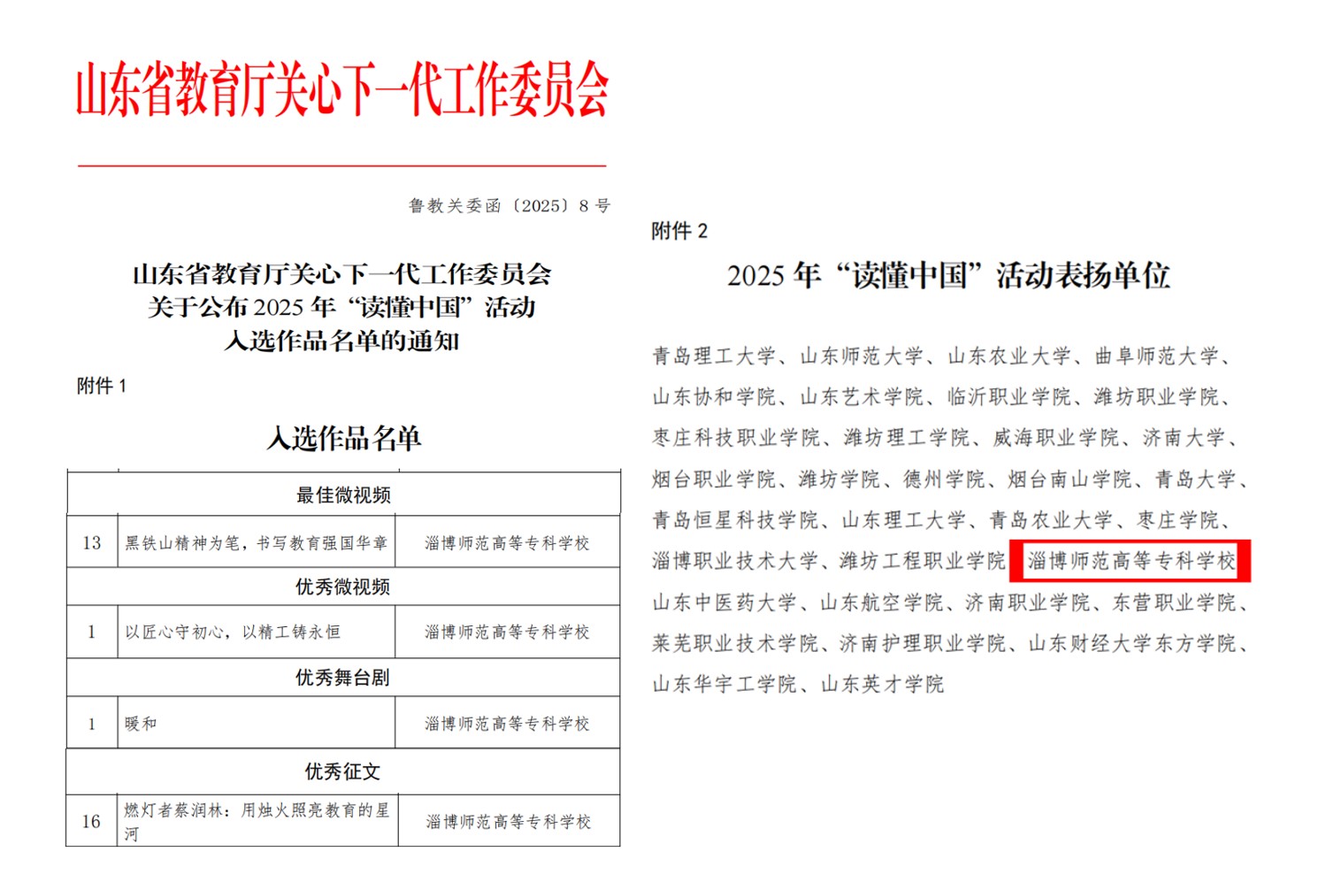 近日,山东省教育厅关心下一代工作委员会公布了2025年“读懂中国”活动入选作品名单。我校有4件作品入选获奖,同时获评“2025年‘读懂中国’活动表扬单位”,在全省高校2025年“读懂中国”活动中再获佳绩。